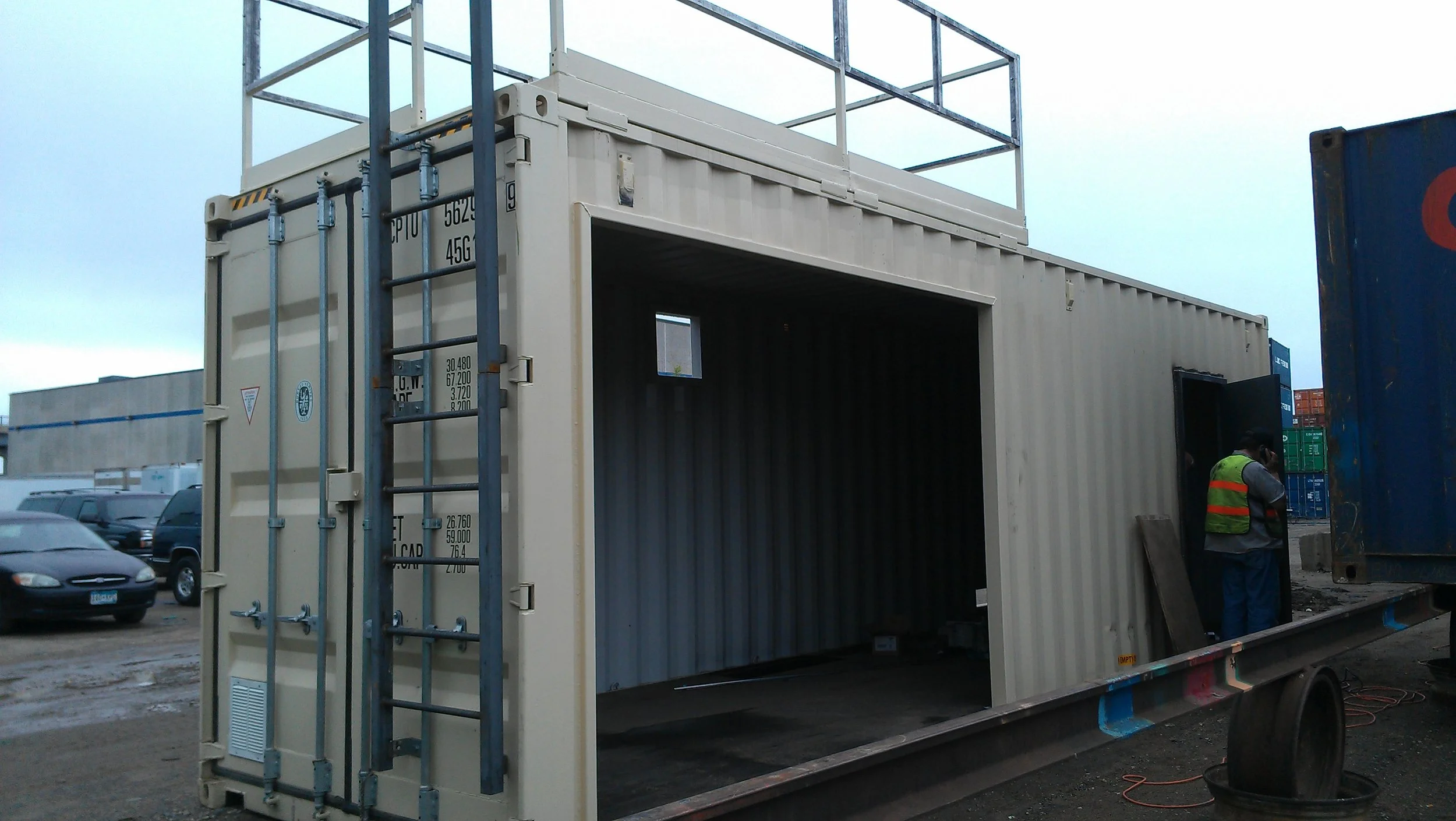 40’ container shortened to 28’ long, cut out for roll-up added and personnel door plus a removable platform with railing and removable ladder